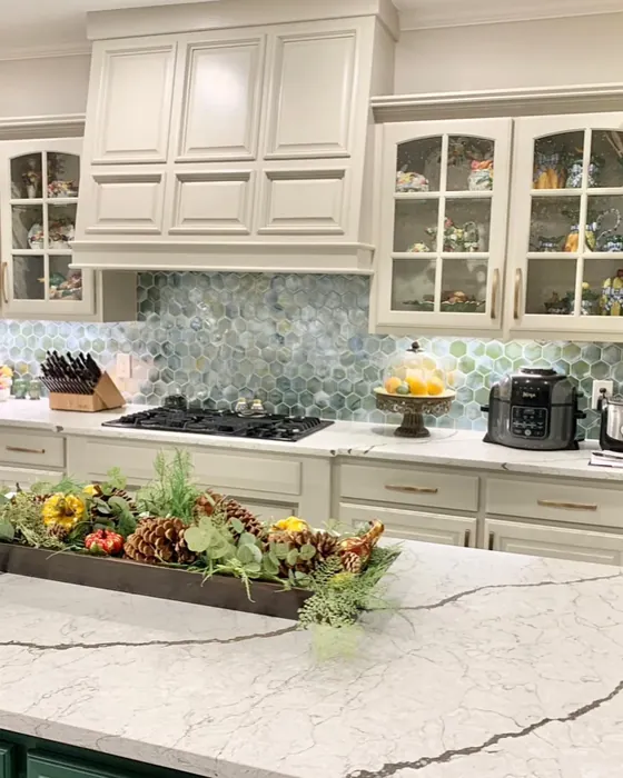 Sherwin Williams SW 7014 on kitchen cabinets (2 photos)